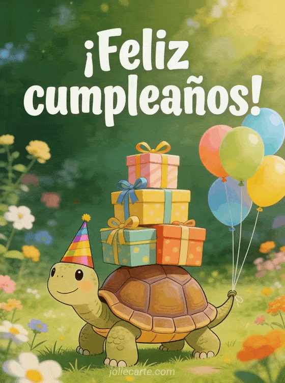 Hazla reír con este gif de cumpleaños gracioso con una tortuga adorable con sombrero de fiesta cargando una pila de regalos coloridos. Descubre también una feliz cumpleaños querida amiga tarjeta o un gif feliz cumpleaños mujer gracioso para más saludos divertidos.
