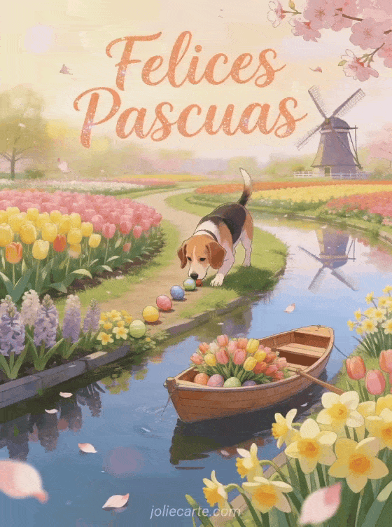 Comparte este encantador gif de Pascua gratis con un perro beagle en un jardín primaveral lleno de tulipanes, narcisos y jacintos. Descubre también tarjeta felices Pascuas o tarjetas virtuales gratis Pascua.