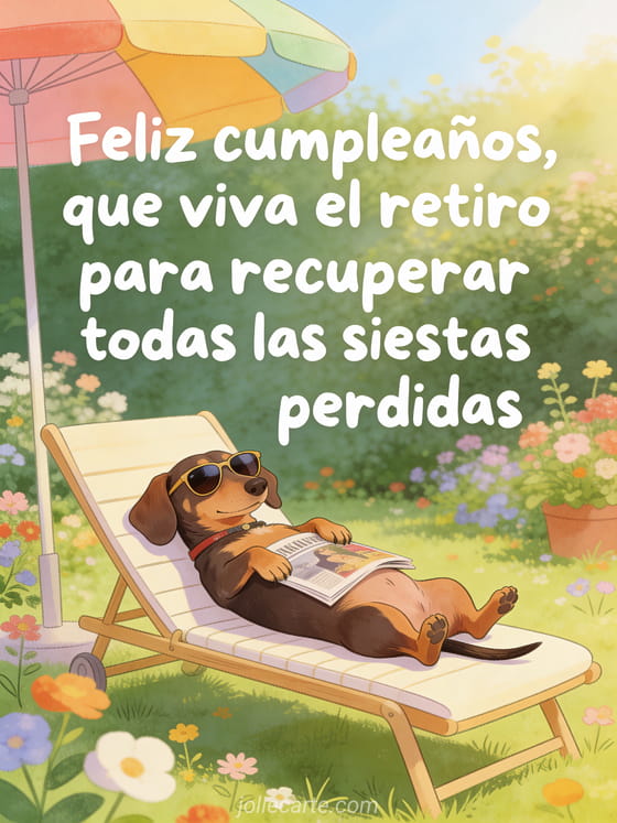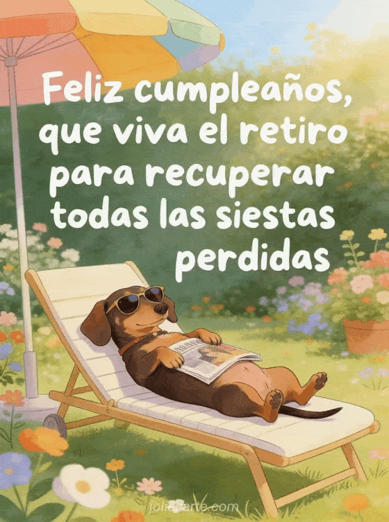 Este gracioso gif de cumpleaños para hombres muestra un adorable dachshund completamente estirado en una tumbona de jardín con gafas de sol y una revista en la barriga, rodeado de flores y un parasol colorido. La tarjeta perfecta para hacer reír a cualquier hombre en su cumpleaños. Descubre también una bonita tarjeta de cumpleaños animada para hombre gratis o una tarjeta de cumpleaños graciosa para hombre.
