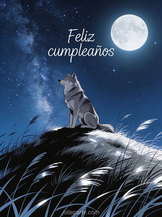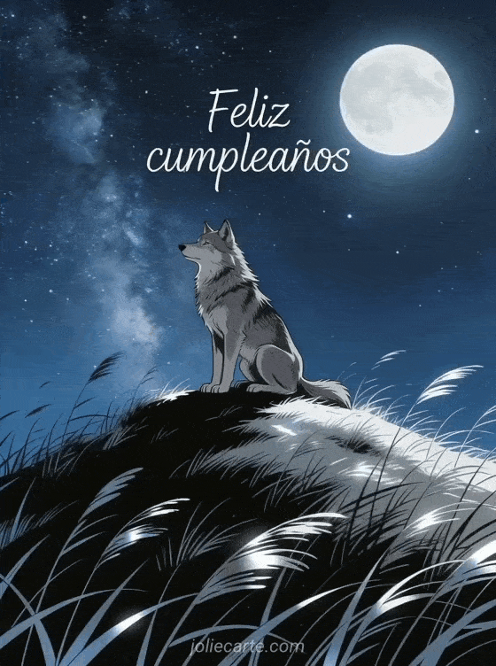 Envía un espectacular gif de feliz cumpleaños para un hombre con un majestuoso lobo bajo el cielo estrellado. Descubre también humor gracioso cumpleaños hombre o una tarjeta virtual cumpleaños hombre gratis.