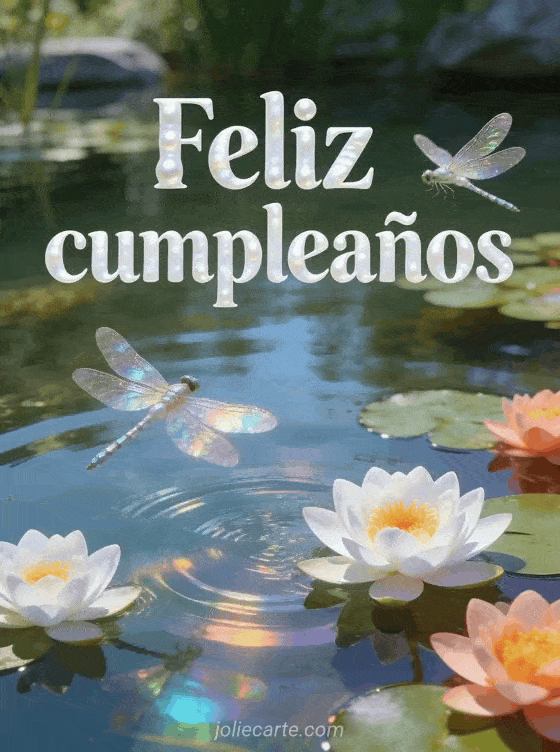 Alegra su día especial con este gif feliz cumpleaños con un tranquilo estanque de nenúfares y libélulas iridiscentes. Descubre también una tarjeta feliz cumpleaños graciosa mujer o una imagen feliz cumpleaños mujer para hacerla sonreír.
