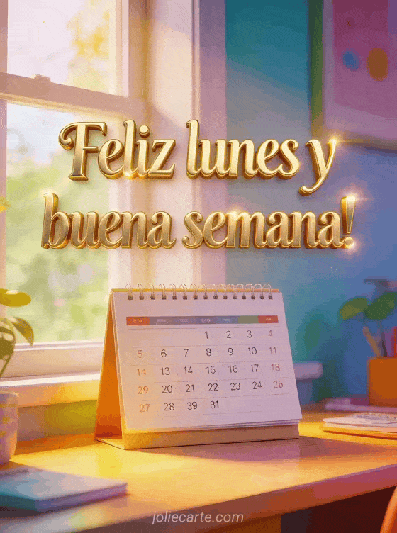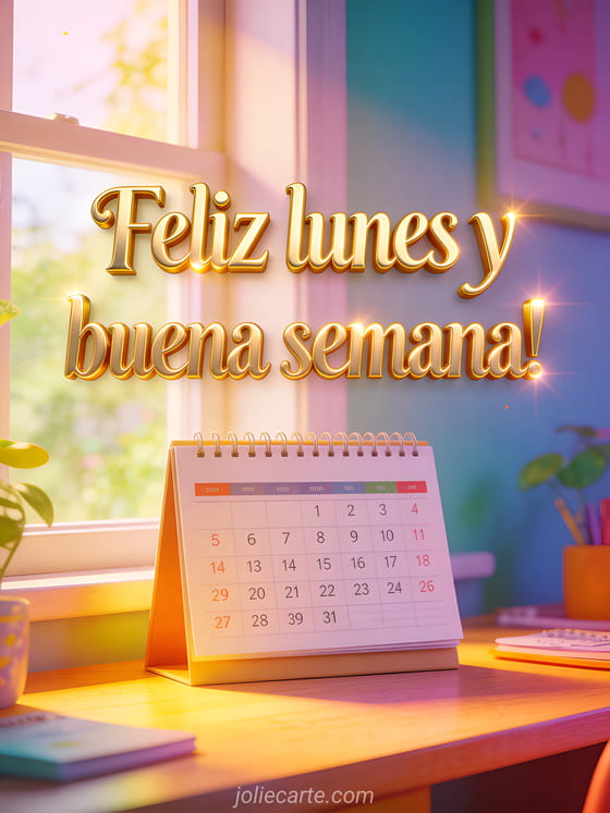 Comparte feliz lunes y buena semana con tipografía dorada refinada, un calendario nuevo sobre un escritorio junto a una ventana soleada y luz colorida de la mañana. También pueden enviar una feliz lunes imagen animada, una feliz lunes buena semana imagen gratis o buenos días feliz lunes y buena semana besos.