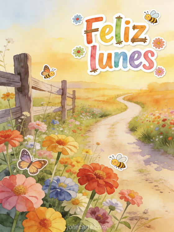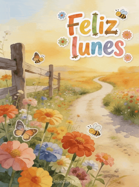 Comparte un delicado Feliz lunes con zinnias coloridas, mariposas y cálida luz de la mañana junto a un sendero campestre. Descubre también imagen buenos días feliz lunes, amistad excelente feliz lunes y buena semana y buena semana feliz lunes buena semana.