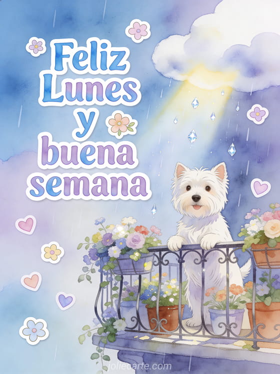 Empieza la semana con esta encantadora tarjeta de lunes con un adorable westie blanco en un balcón florido con lluvia y sol. Descubre también humorístico feliz lunes y buena semana humor o sms buena semana y buen lunes.