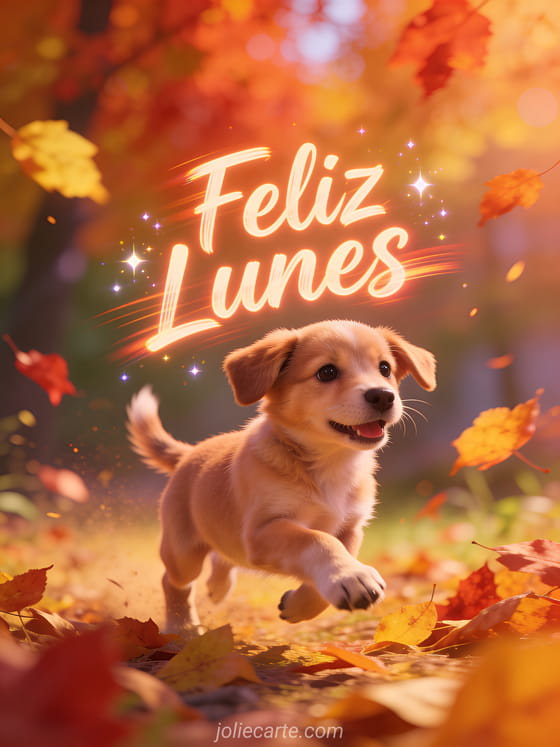 Empieza la semana con una sonrisa enviando esta adorable tarjeta de feliz lunes. Un lindo cachorro corre alegremente entre hojas de otoño, lleno de energía. Descubre también una tarjeta de feliz lunes o una tarjeta de feliz lunes y buena semana.