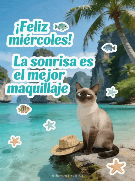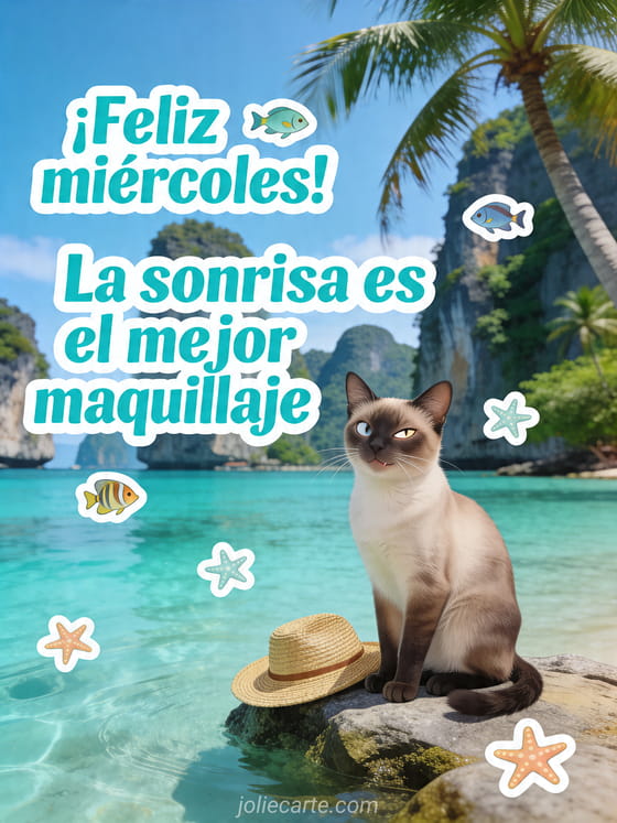 ¡feliz miércoles! la sonrisa es el mejor maquillaje un saludo divertido de miércoles con sol, mar y una sonrisa traviesa