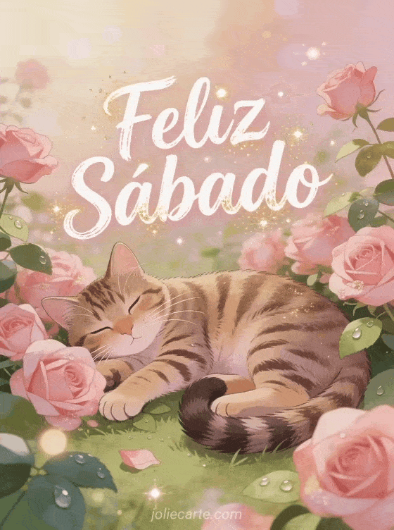 Envía un dulce saludo de feliz sábado con un adorable gato atigrado estirándose entre rosas rosadas en un acogedor jardín. Una forma encantadora de desear un maravilloso sábado. Descubre también una tarjeta buen día sábado o una tarjeta alegre de sábado.