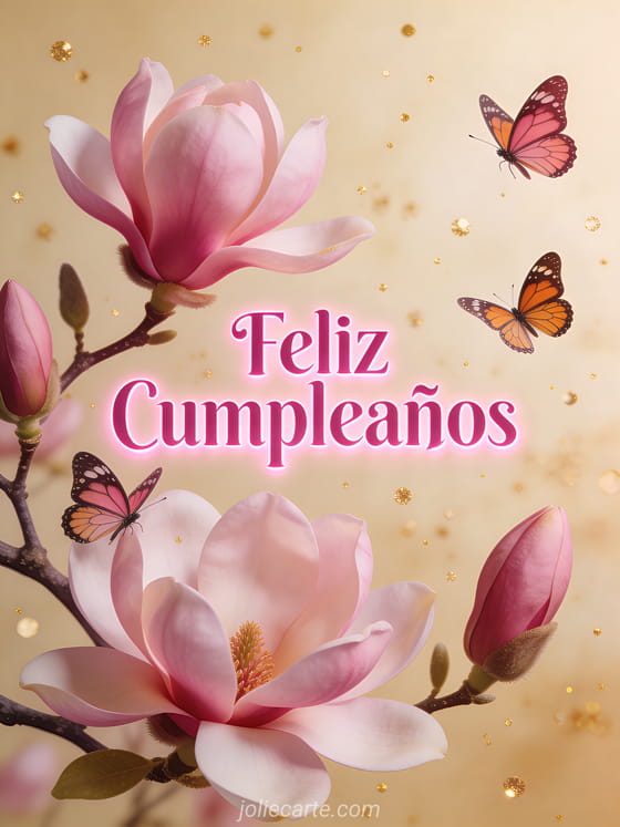 Celebra a una mujer especial con esta tierna tarjeta de cumpleaños con letras rosa fucsia luminosas, mariposas monarca revoloteando alrededor de flores de magnolia en eclosión sobre un fondo crema cálido con partículas doradas. Descubre también una gif gratis de cumpleaños para mujer o una tarjeta de cumpleaños para mujer.