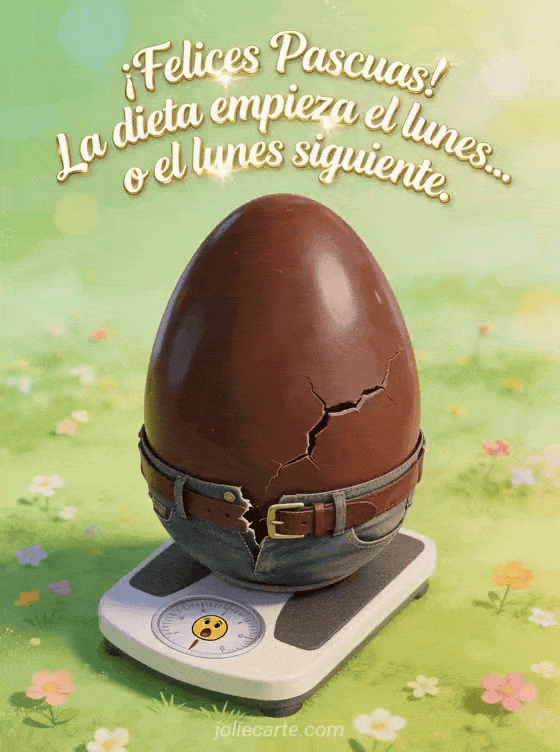 Envía un divertido GIF de Pascua con un huevo de chocolate que no cabe en su cinturón. La dieta empieza el lunes... o el siguiente. Descubre también una tarjeta de Pascua humorística o una imagen graciosa de Pascua y una tarjeta de Pascua divertida.