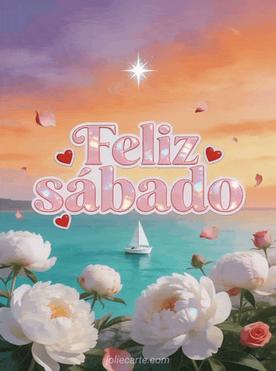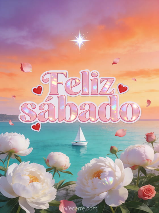 Compartan una tarjeta romántica de feliz sábado con letras rosa empolvado nacaradas, pequeños corazones rojos, pétalos de rosa, una bahía turquesa al crepúsculo, un pequeño velero blanco navegando en calma y peonías blancas en primer plano bajo un cielo rosa, naranja y violeta. Vean también feliz sábado feliz fin de semana, buenos días feliz sábado gifs animados o feliz sábado smiley.