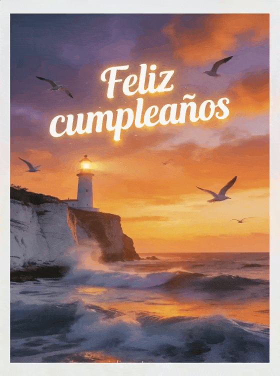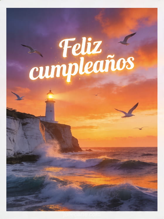 Comparte un poderoso feliz cumpleaños con esta tarjeta fotorrealista que muestra un faro en un acantilado al atardecer, olas rompiendo y gaviotas en el cielo. También puedes descubrir tarjeta cumpleaños animada gratis musical hombre, animado feliz cumpleaños niño gif o tarjeta cumpleaños animada 1 año.