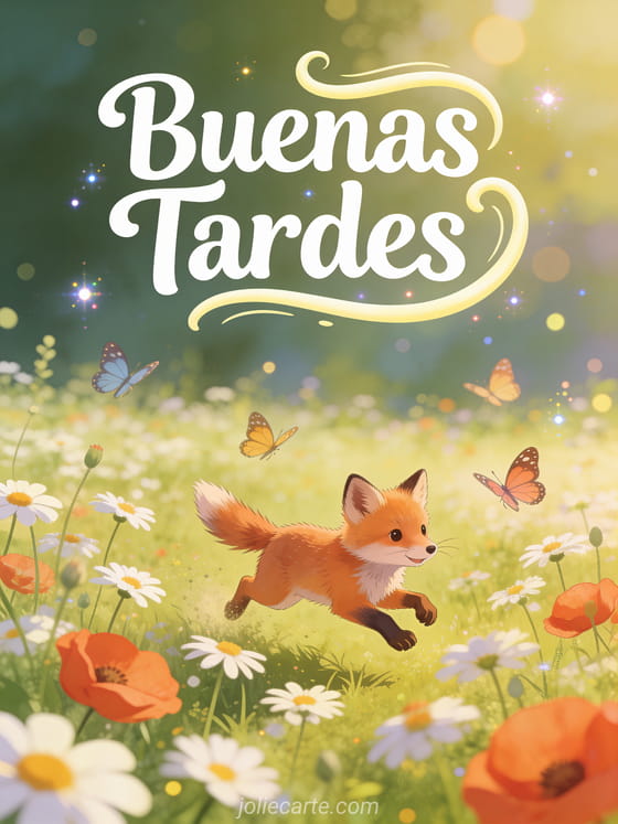 Una alegre y encantadora tarjeta de buenas tardes con un travieso zorro cachorro persiguiendo mariposas en un prado lleno de margaritas y amapolas. Descubre también un gif buenas tardes gracioso, una imagen buenas tardes gatito o un buen provecho y buenas tardes.