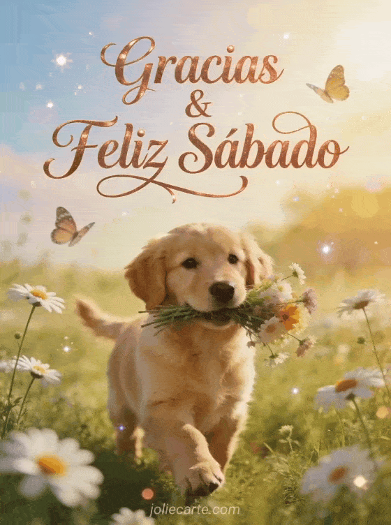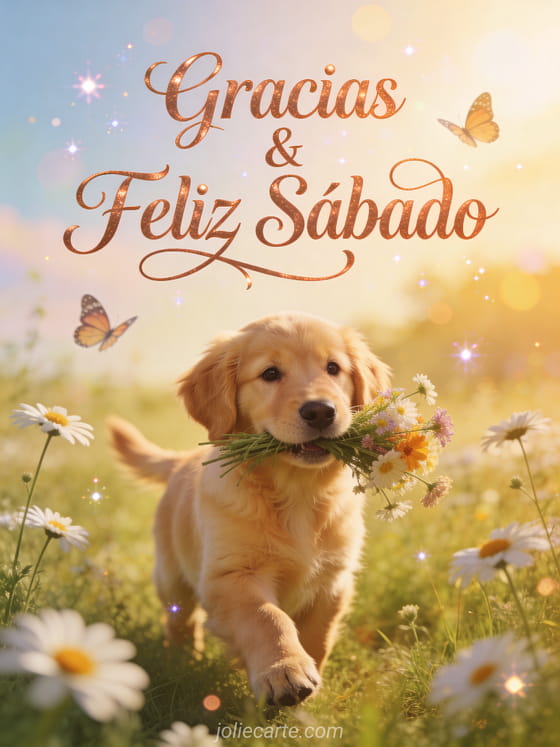 Comparte gratitud y alegría de fin de semana con esta tarjeta de gracias y feliz sábado con un agradecido cachorro de golden retriever sosteniendo un ramo en un prado soleado. Descubre también una tarjeta de lindo sábado y buen fin de semana o de imagen feliz sábado gato.