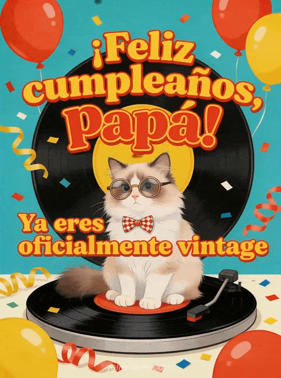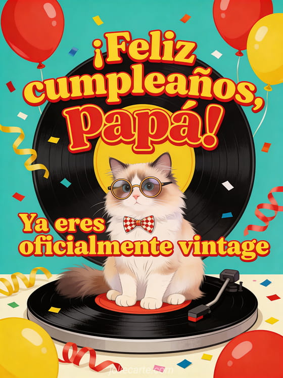 Envía una tarjeta gracioso feliz cumpleaños papá divertido con letras retro, un gato ragdoll con lentes vintage y moño sobre un disco de vinilo gigante, globos y confeti. Descubre también un dibujo de niño cumpleaños papá, una feliz cumpleaños papá imagen o una tu hija feliz cumpleaños papá.