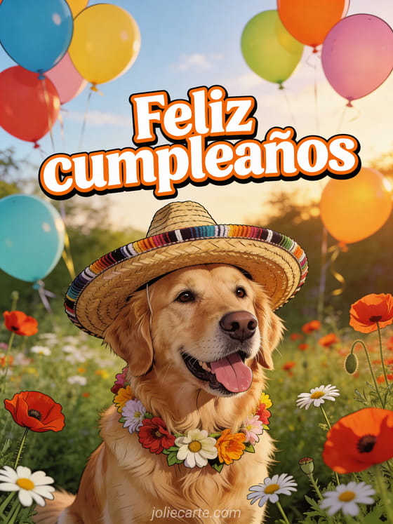 Envía esta graciosa tarjeta de feliz cumpleaños con perro — un golden retriever fotorrealista con sombrero mexicano y collar de flores en un jardín de amapolas y margaritas. Descubre también un gif de feliz cumpleaños gracioso o un gif animado gracioso de feliz cumpleaños.
