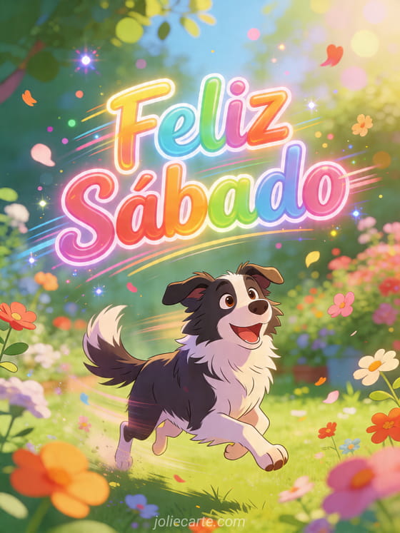 Comparte un animado Feliz sábado con esta tarjeta gratis que muestra un perro border collie corriendo feliz entre flores por un jardín colorido. También puedes descubrir hermoso sábado imagen, humorístico feliz sábado humor o buenos días y feliz sábado.