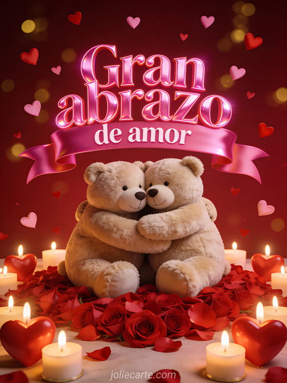 Envía esta apasionada tarjeta de abrazo con dos osos de peluche gigantes abrazándose sobre una cama de pétalos de rosa roja rodeados de velas en forma de corazón y corazoncitos rojos y rosas cayendo como una lluvia de amor. Una forma romántica de enviar un cálido abrazo. Descubre también una tarjeta de abrazo de amor con cisnes o una tarjeta de abrazo reconfortante.