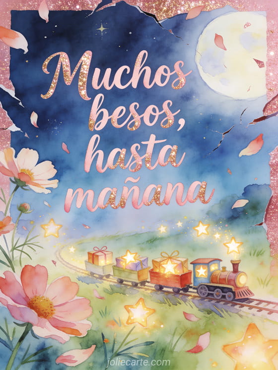 Comparte una despedida soñadora con letras rosa dorado en acuarela, flores cosmos que cruzan el borde, un pequeño tren de juguete que lleva paquetes de estrellas brillantes por una pradera iluminada por la luna y colores lúdicos. Descubre también una tarjeta de besos y hasta mañana imagen, una tarjeta de besos animados hasta mañana o una tarjeta de muchos besos hasta mañana gif.