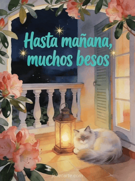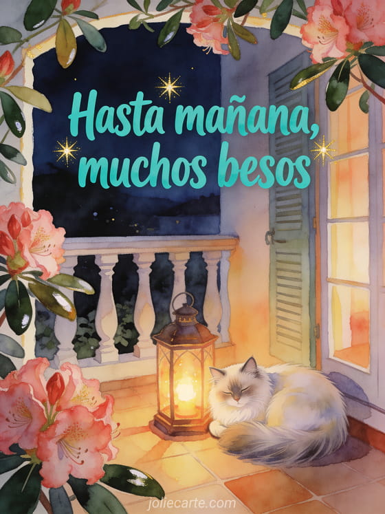 Compartan una despedida acogedora de noche con letras turquesa, rododendros y un gato angora turco acurrucado junto a una linterna encendida en un invernadero tranquilo. También pueden enviar bueno besos hasta mañana, hasta mañana besos imagen o besos hasta mañana imagen.