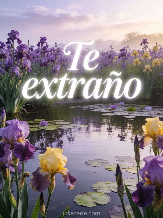 Envía esta hermosa tarjeta con las palabras Te extraño escritas en elegantes letras blancas, con un campo de iris violetas y amarillas junto a un estanque tranquilo bajo un cielo suave de mañana. Descubre también una tarjeta te extraño un poco o una tarjeta te extraño pienso en ti.