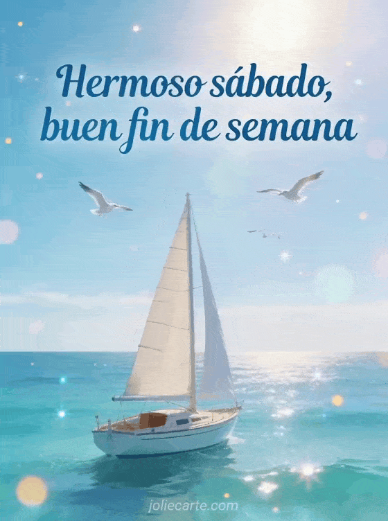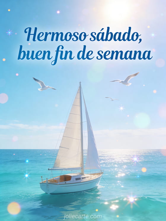 Compartan un saludo luminoso de sábado y fin de semana con un velero tranquilo, mar turquesa, gaviotas volando y sensación de libertad en el agua. También pueden enviar feliz sábado imágenes bonitas o bonita imagen animada de feliz sábado.