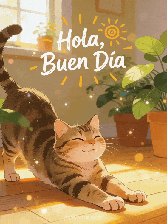 Hola, buen día un alegre hola y buen día de un adorable gato soleado