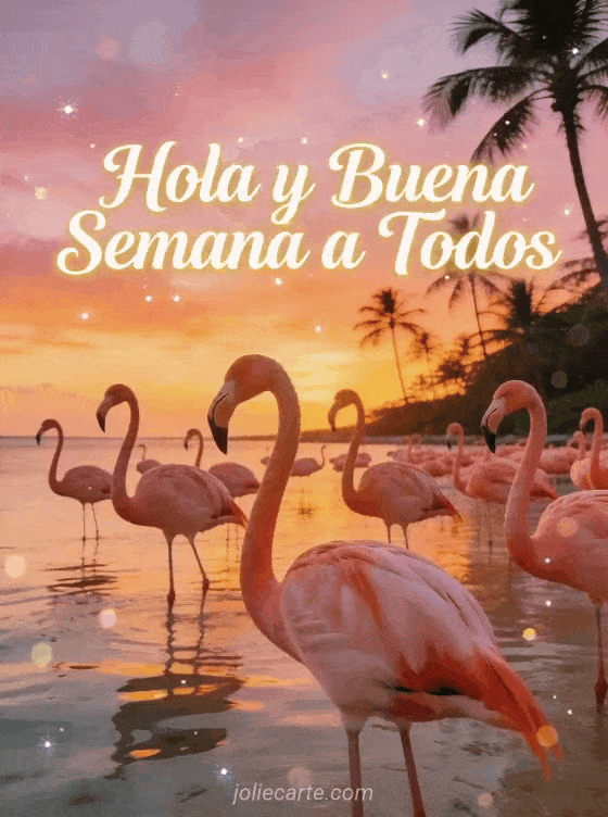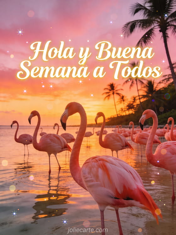 Comparte un alegre Hola y buena semana a todos con esta tarjeta gratis que muestra flamencos rosados en aguas tropicales al atardecer. También puedes descubrir corazón hola buena semana, buena semana imagen o buen día y buena semana.