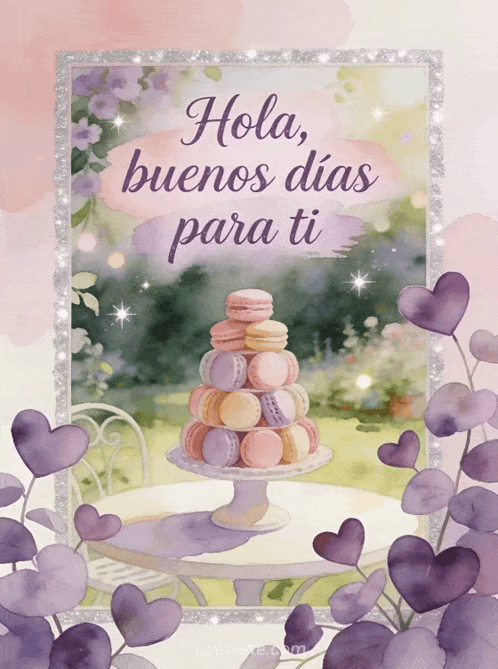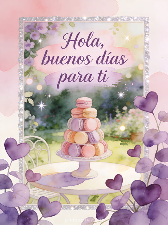 Comparte un saludo refinado con violetas, hojas en forma de corazón y una torre de macarons pastel sobre una mesa de jardín luminosa. También pueden enviar hola tú besos imagen, gatito hola o un dulce saludito besos.
