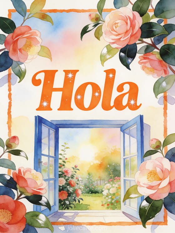 Comparte un hola amigable con letras naranjas alegres, pequeños destellos como estrellas, flores de camelia, hojas brillantes, una ventana azul abierta, un jardín soleado, cielo pastel y luz cálida. También pueden enviar un besito de paso, hola besos de la mañana o hola montón de besos.