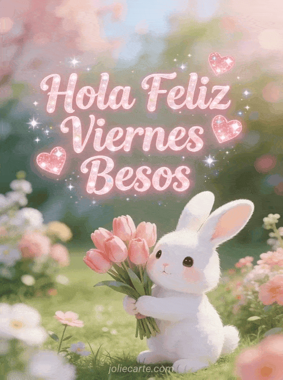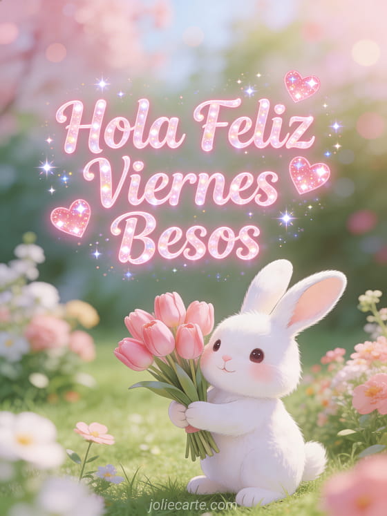 Envía dulces besos de viernes con esta adorable tarjeta. Un lindo conejito blanco sostiene un ramo de tulipanes rosa en un jardín primaveral con destellos de corazones. Descubre también una tarjeta de es viernes buen día o una tarjeta gif divertida de viernes.