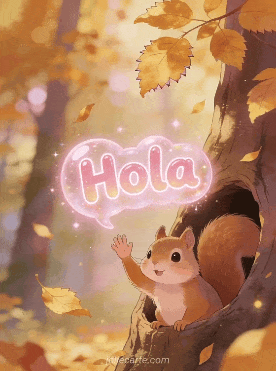 Comparte un alegre hola gif animado con una adorable ardilla saludando en un bosque de otoño. Descubre también una tarjeta hola niño o una tarjeta gif hola besos.