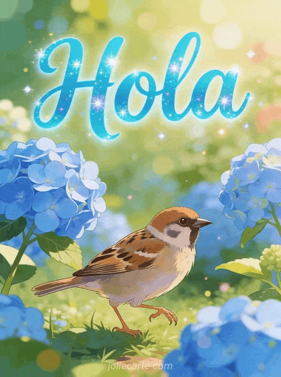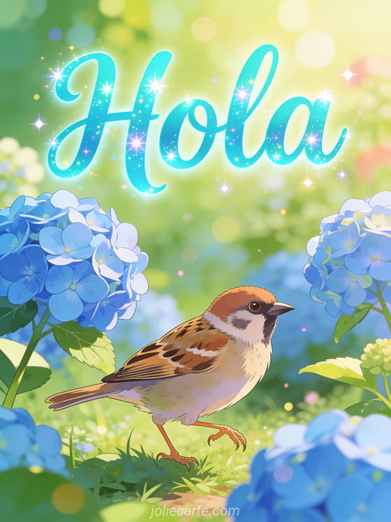 Envía un alegre gif de hola con esta hermosa tarjeta gratis. Un alegre gorrión saltando entre flores de hortensia azul en una vibrante escena matutina de jardín, perfecta para un saludo dinámico y animado. Descubre también una tarjeta hola cómo estás o una tarjeta de buenos días.