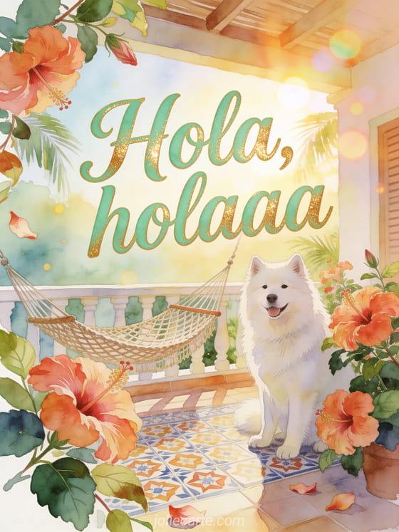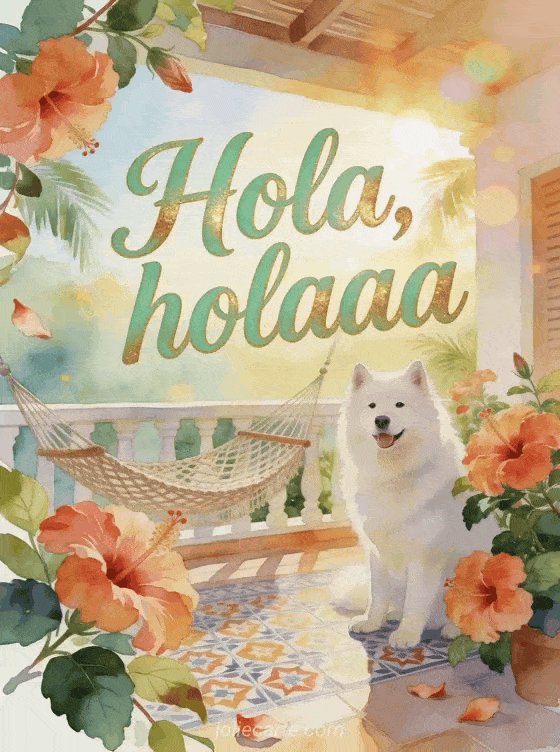 Envía hola holaaa gif con letras verde menta en acuarela, un samoyedo junto a flores de hibisco, azulejos decorados, una hamaca tejida y luz cálida de amanecer en una terraza tropical. También puedes compartir una tarjeta de hola besitos gif lindo, una tarjeta de buen día hola buenos días gif o una tarjeta de hola buenos días gifs.