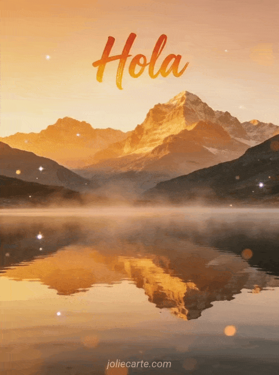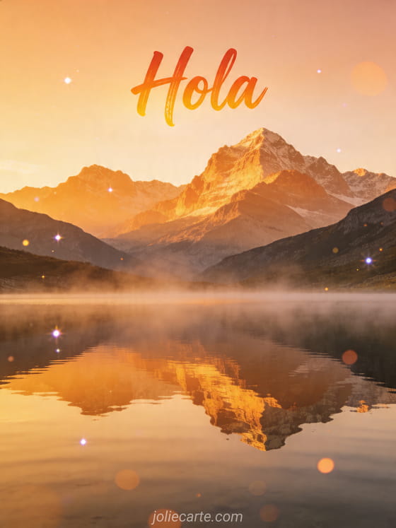 Comparte esta serena tarjeta de hola con un lago de montaña al amanecer, suave neblina y un reflejo perfecto en el agua. También pueden descubrir hola matinal, manda saludos y hola.