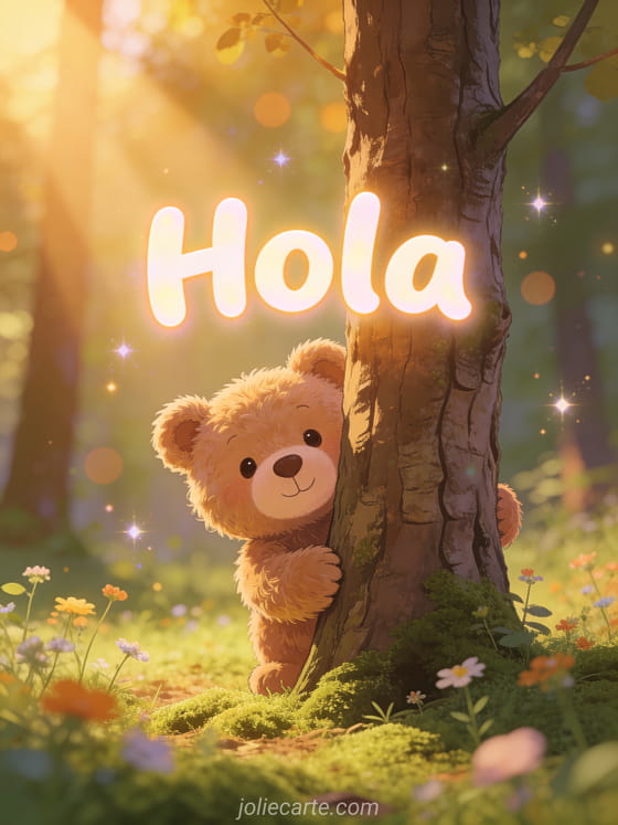 Envía este encantador hola con un adorable oso de peluche que asoma desde detrás de un árbol en un bosque soleado. Perfecto para un saludo tierno. Descubre también una tarjeta búho hola o una tarjeta hola pequeño periquito gif.