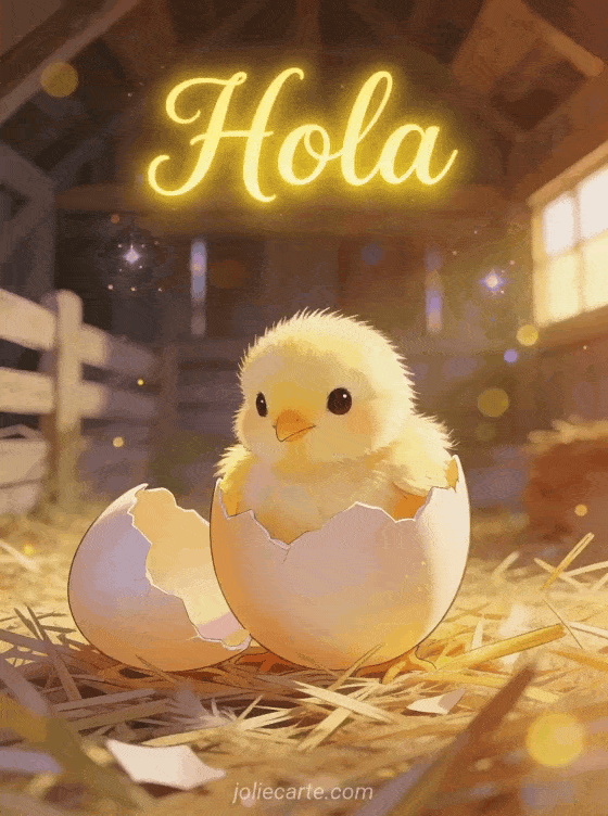 Di hola con esta adorable tarjeta con un pequeño pollito esponjoso saliendo del cascarón en un acogedor granero con paja y luz cálida. Descubre también una tarjeta hola tú, una tarjeta un pequeño saludo para ti o una tarjeta hola buenos días buen día.
