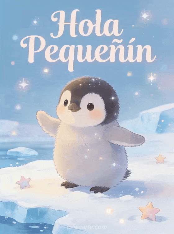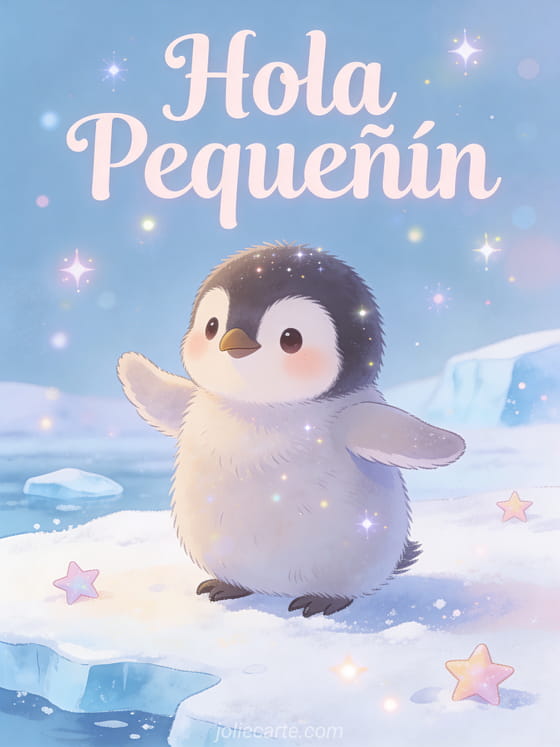 Comparte una adorable tarjeta de hola pequeñín con un pingüino bebé agitando sus pequeñas alas en una escena antártica nevada con suave hielo azul. Descubre también una tarjeta hola pequeño periquito, una tarjeta hola sol o una tarjeta hola fotos.