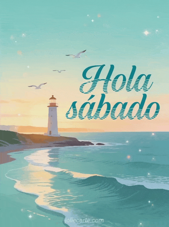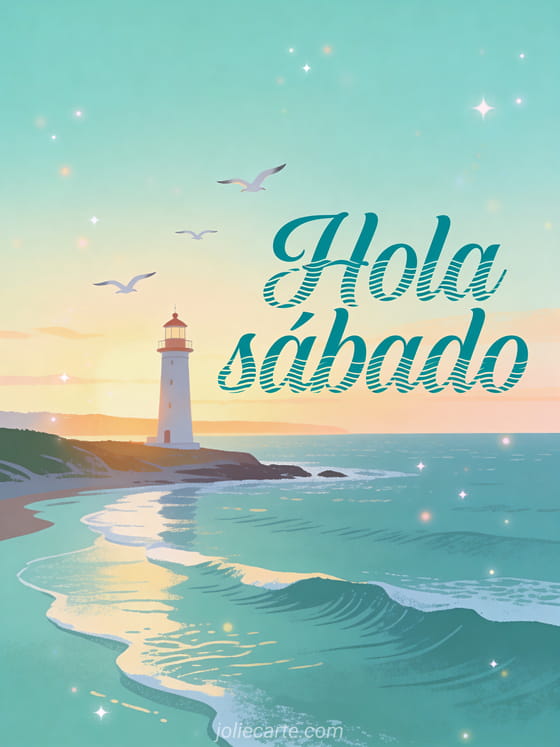 Envía un saludo sereno de hola sábado con letras verde azulado, un faro al amanecer y gaviotas volando sobre un paisaje costero tranquilo. Descubre también una tarjeta de que tengas un buen sábado, una tarjeta de feliz sábado con muchos besos o una bonita imagen de feliz sábado.