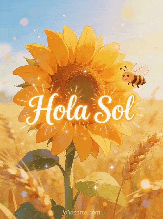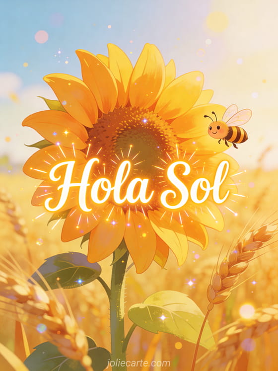 Comparte una hermosa tarjeta de hola sol con un alegre girasol y una abeja sonriente en un campo luminoso de verano con trigo dorado. Descubre también una tarjeta lindo hola, una tarjeta hola fotos o una tarjeta hola perro.