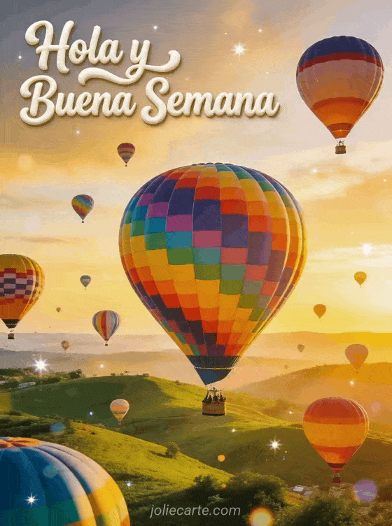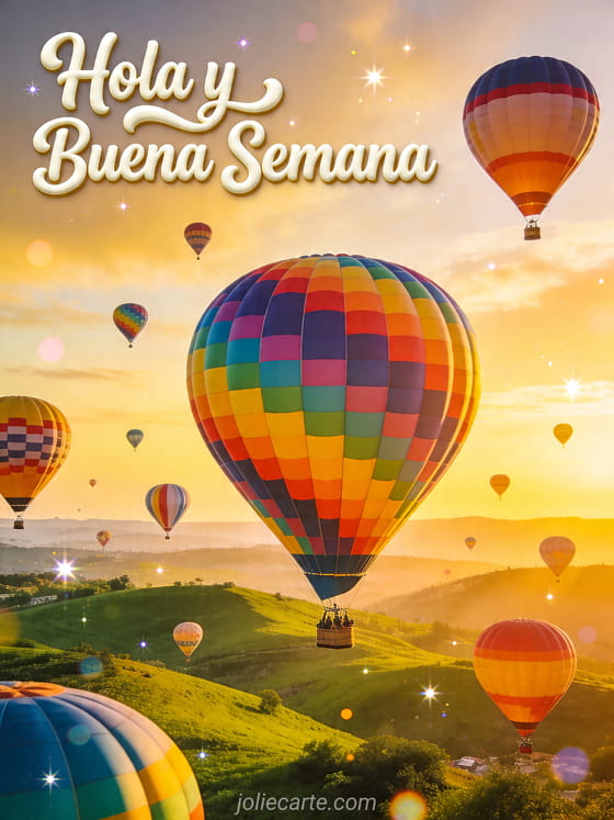 Comparte un inspirador Hola y buena semana con esta tarjeta gratis que muestra coloridos globos aerostáticos elevándose sobre colinas verdes al amanecer. También puedes descubrir feliz semana para ti, buena semana besos o feliz semana gato.