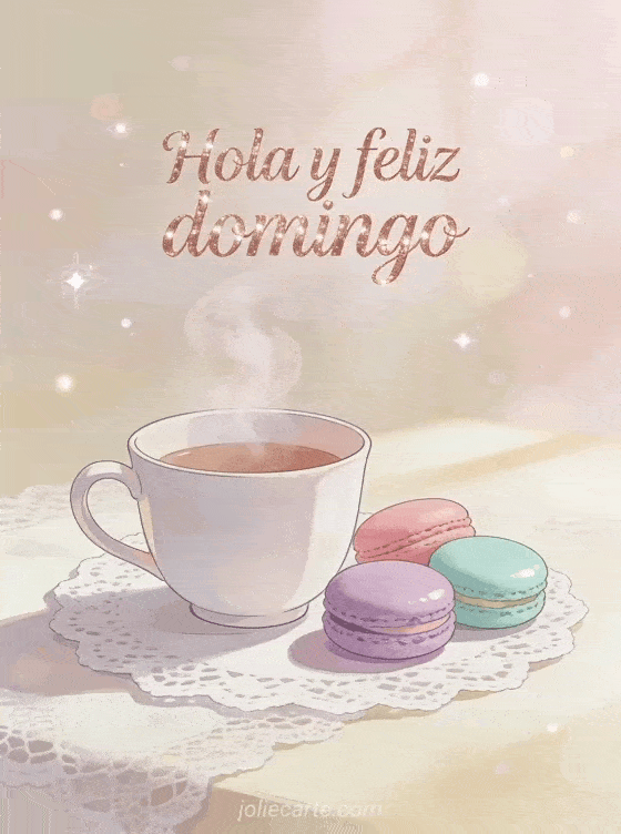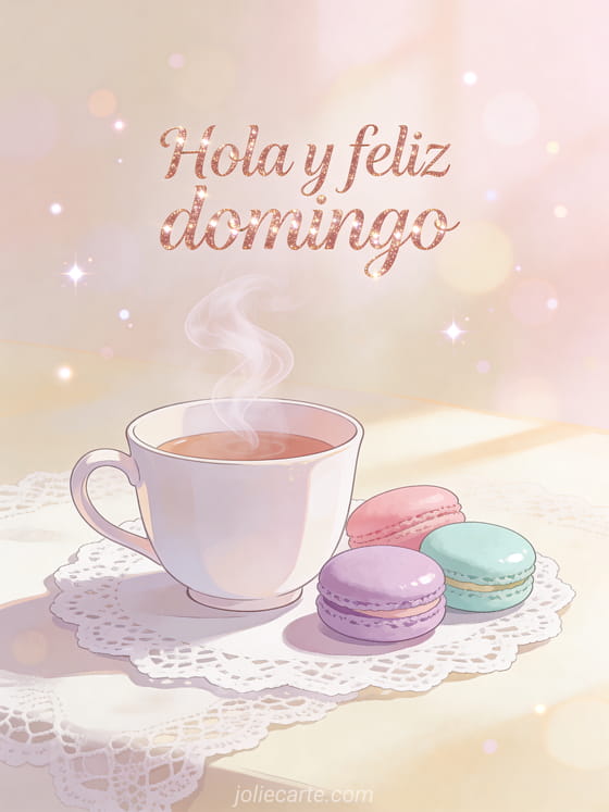 Comparte un saludo delicado de hola y feliz domingo con letras en oro rosa, una taza humeante y dulces macarons. Descubre también una feliz domingo acogedor imagen, feliz domingo imágenes muy bonitas o feliz domingo gif animado gif animado brillante.