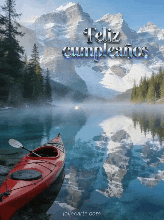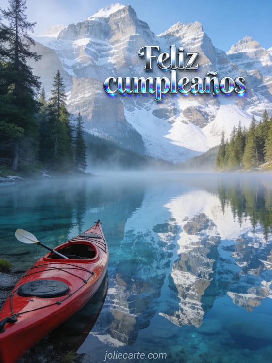 Envía una impresionante tarjeta de cumpleaños con un kayak rojo junto a un lago de montaña cristalino al amanecer, con reflejos perfectos de los picos nevados. Descubre también una tarjeta cumpleaños hombre gratis humor o feliz cumpleaños hombre.
