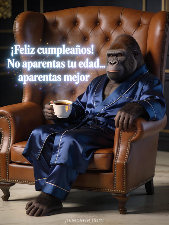 Compartan esta tarjeta humorística con un gorila elegante en bata de seda tomando café en un sillón clásico. También pueden ver feliz cumpleaños gracioso, cumpleaños gato humor y video cumpleaños gracioso.