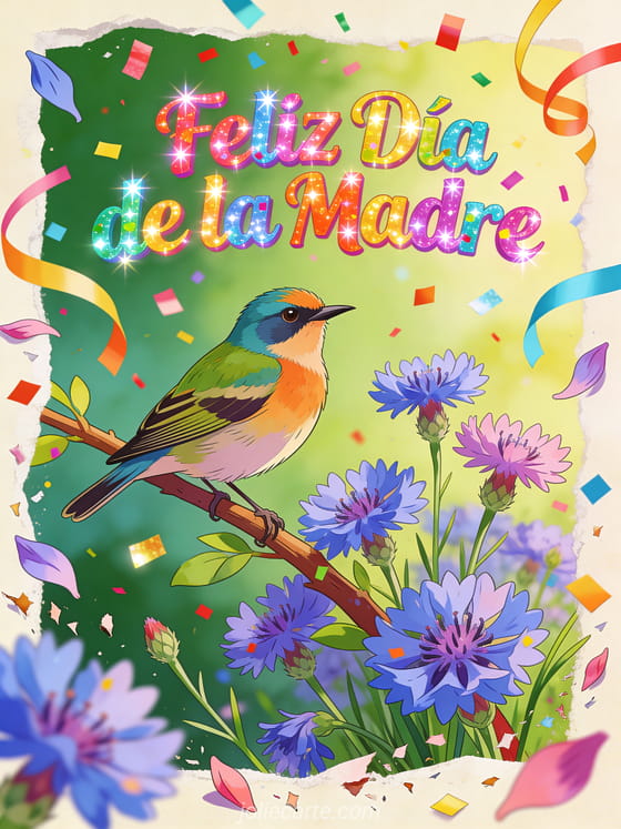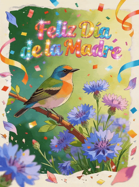 Celebra con esta vibrante tarjeta de hoy es el día de la madre. Un verdecillo posado en acianos en flor en una escena festiva con confeti de colores y serpentinas brillantes. Descubre también día de la madre tarjetas gratis o una tarjeta de feliz día de la madre.