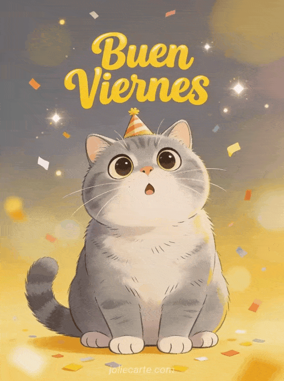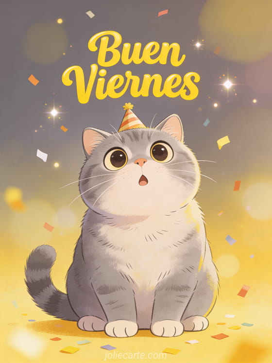 Celebra el viernes con esta divertida tarjeta con un gordito gato british shorthair gris con ojos sorprendidos y un sombrero de fiesta. Descubre también gif feliz viernes humor o viernes buen día.