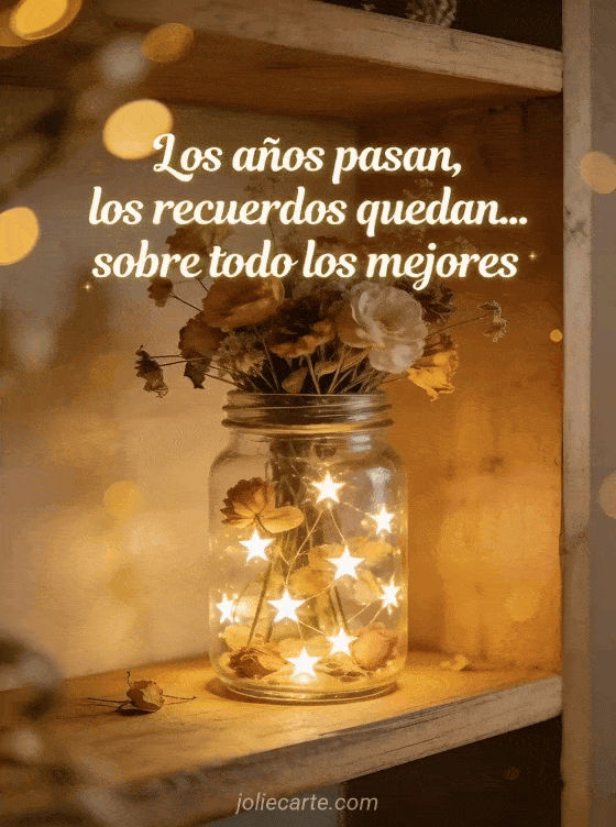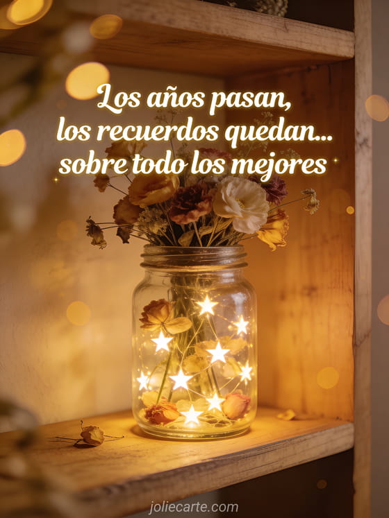 Compartan esta tarjeta fotorrealista con frasco luminoso, flores secas y bokeh dorado para un ambiente nostálgico. También pueden ver imágenes cumpleaños humor hombre, mensaje cumpleaños gracioso y hombre gif cumpleaños humor.