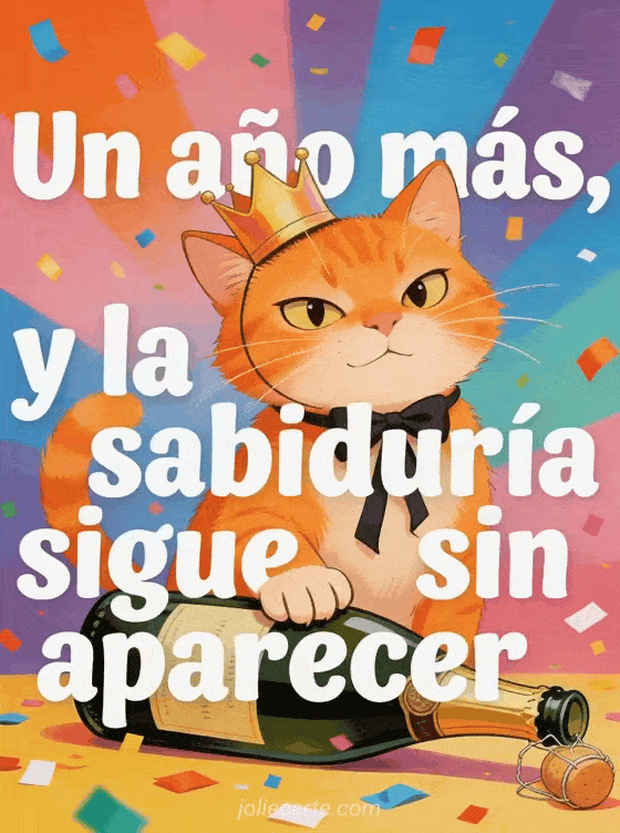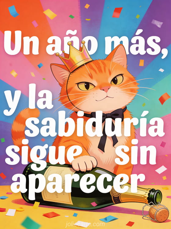 Envía esta graciosa tarjeta de humor de cumpleaños para hombre con un travieso gato naranja con una corona torcida y una botella de champán volcada, confeti por todas partes. Descubre también una tarjeta virtual cumpleaños hombre gratis o un gif cumpleaños hombre humor.