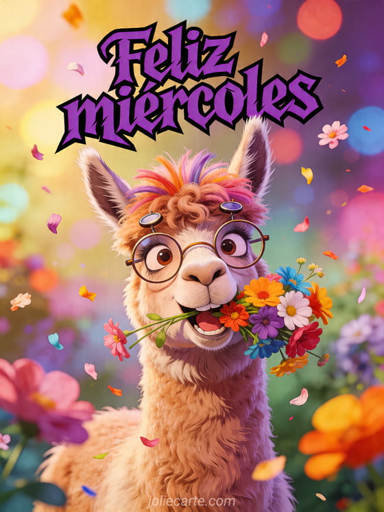 Envía una tarjeta de Feliz miércoles llena de humor con una llama chistosa y flores coloridas. Descubre también bonitas tarjetas virtuales gratis feliz miércoles, sonrisa día sonrisa feliz miércoles y imagen miércoles lluvioso.
