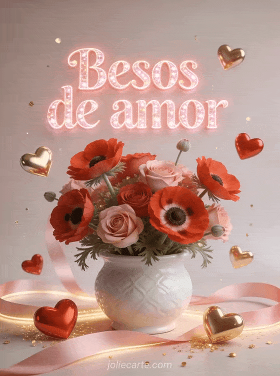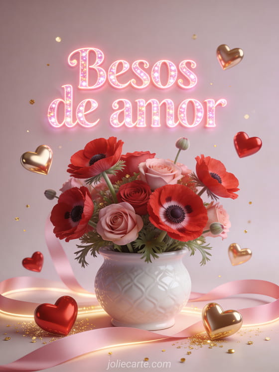 Envía esta romántica tarjeta animada con las palabras Besos de amor escritas en letras rosas brillantes con efecto centelleante, con un hermoso ramo de anémonas rojas y rosas en una maceta de cerámica blanca, rodeado de corazones 3D rojos y dorados flotantes. Descubre también una amor abrazo besos en el cuello o un video besos de amor.