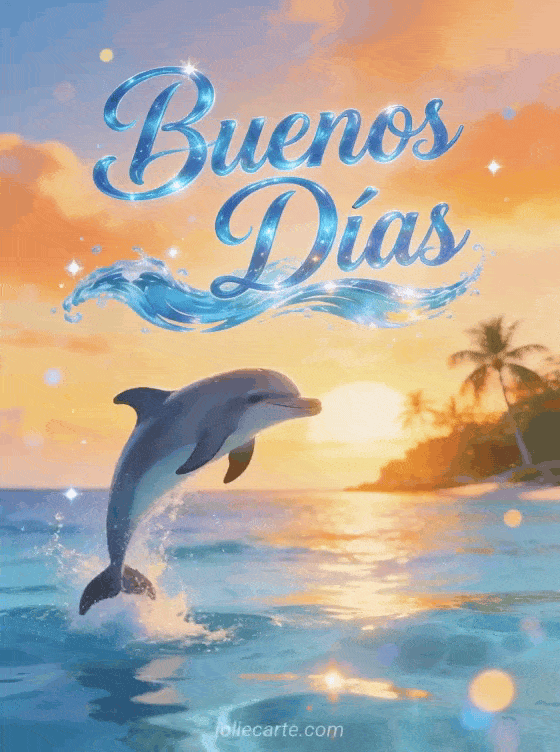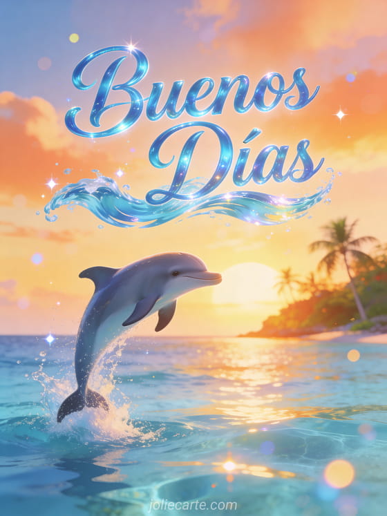 Comparte una hermosa imagen animada de buenos días con un delfín saltando del agua cristalina al amanecer con una isla tropical de fondo. Descubre también una tarjeta buenos días foto, una tarjeta les deseo buenos días o una tarjeta de imágenes buenos días.